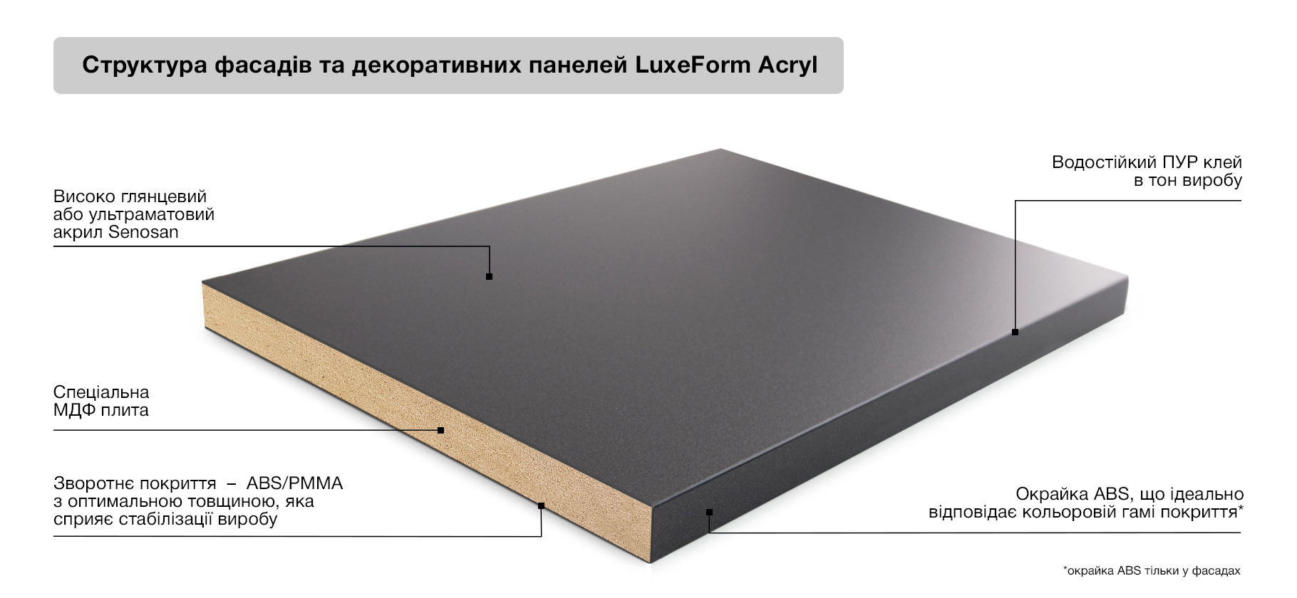 LuxeForm Acryl – колекція декоративних плит та фасадів, що вирізняються стильним дизайном та насиченим кольором. Заворожуюча і загадкова, гармонійна і надійна поверхня акрилових фасадів заповнює простір, додає шарму всьому дизайну.