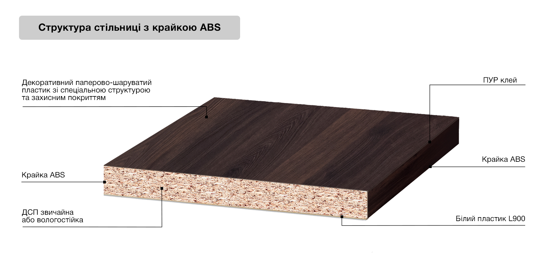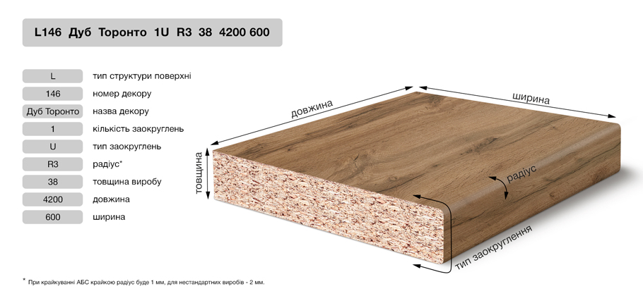 В доповнення до стільниці можна придбати плінтус та стінову панель. Стільниці без заокруглення та торці пропонуємо оброблювати окрайкою ABS. На відміну від аналогів, вона стійка до ударів та деформацій.