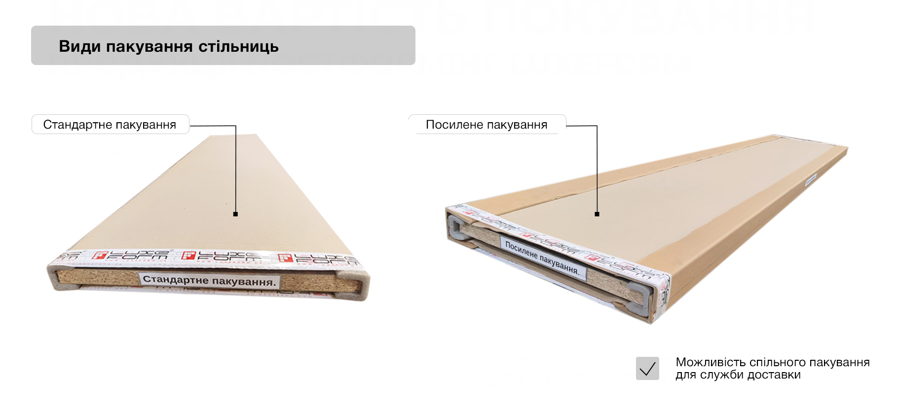 Стільниці LuxeForm виготовлюються за технологією постформінг та ABS крайкування. Це сучасний спосіб обробки, при якому під дією високих температур ДСП огортається високоякісним пластиком. Зі зворотнього боку стільницю захищає протипружний папір. Додатково наноситься водобар’єрний шов, який запобігає потраплянню вологи.